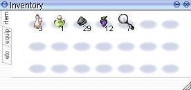 Okno inwentarza podzielone jest na trzy grupy:item[przedmioty typu:potion,flying wing], equip[uzbrojenie] oraz etc[inne].