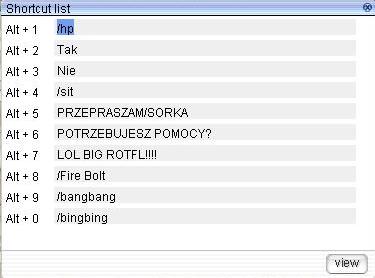 Tak samo jak QB bardzo przydatne. Możemy pod dane kombinacje[alt+1do alt+9] różne bindy ustawiać. Mogą to być emotionki[/kis e/4 itd.], komendy[/organize <nazwa_party>, /sit itd.] lub też teksty mówione[Tak jak przedstawione na rysunku]. Klikając przycisk "View" otwiera się okno emotionków. Poza nimi są jeszcze inne uśmieszki: "ctrl+ -", "ctrl+ +", "/e1-12".