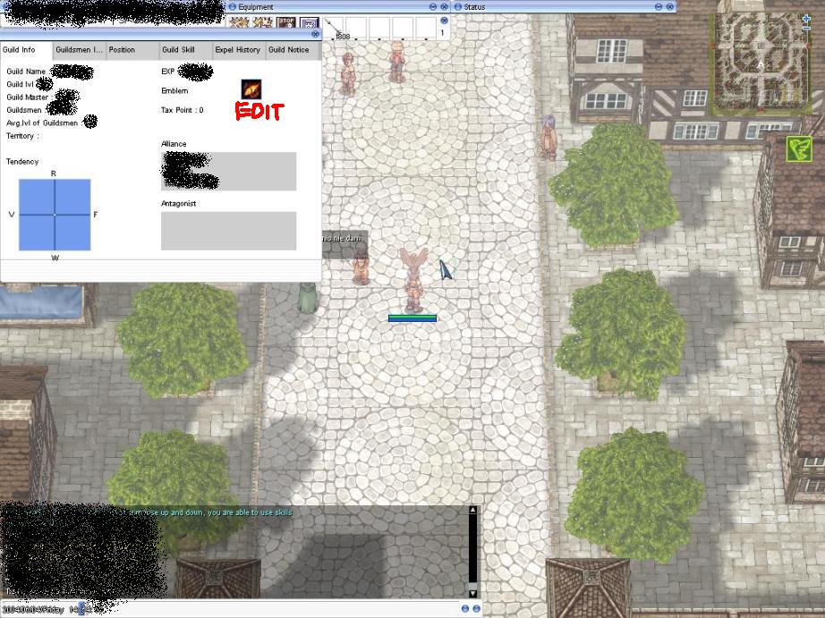 Gildia jest to stowaryszenie kilku graczy, którzy walczą pod dowództwem GM[Guild Master-czyli tego co założył gildie :)]. Co taka gildia daje? 1. Dużo zabawy 2. Uczestnictwo w WoE. Aby założyć własną gildie potrzeba itemka o nazwie Emperium [dostępny od:Orc Zombie, Golden Thief Bug, Angeling, Baphomet, Fake Angel, Ghostring, Mimic, Shining Plant Requiem, Were Wolf, Osiris, Moonlight]. Komenda na zakładanie gildii to "/guild nazwa_gildii".Można zrobić własny emblem gildii-musi mieć wymiary 24x24 i format bmp. Nastepnie trzeba go wrzucić do nowo utworzonego folderu "Emblem" w głównym katalogu gry . Aby ustawić emblem należy w czasie gry wejśc w okno gildii[alt+g], kliknąć na przycisk "Edit" i wybrać emblem. Aby kogoś zaprosić do gildii należy podobnie jak przy party kliknąć prawym na gracza i wybrać opcję "Ask (nazwa gracza) to join (nazwa gildii) guild".Aby wyrzucić kogoś z gildii należy kliknąć na zakładke Guildsman Info-prawym na gracza, wybrać opcję "Expel from Guild" i napisać powód.