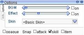 Tutaj można włączyć BGM[Background Music], która jest domyślnie wyłączona, oraz wyłączyć efekty. Również można zmienić skin interfejsu[klika skinów do pobrania http://ragnarok.gamona.de/index.php?show=skin ]. Wystarczy skiny wrzucić do folderu "skin" w katalogu głównym gry. Można też włączyć interesującą opcje mianowicie "Opaque". Zaznaczając ją oraz obok niej skrzynki[snap, skill, item]nasz kursor będzie automatycznie "nachodził" na dany cel, bądź przedmiot .
